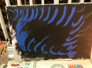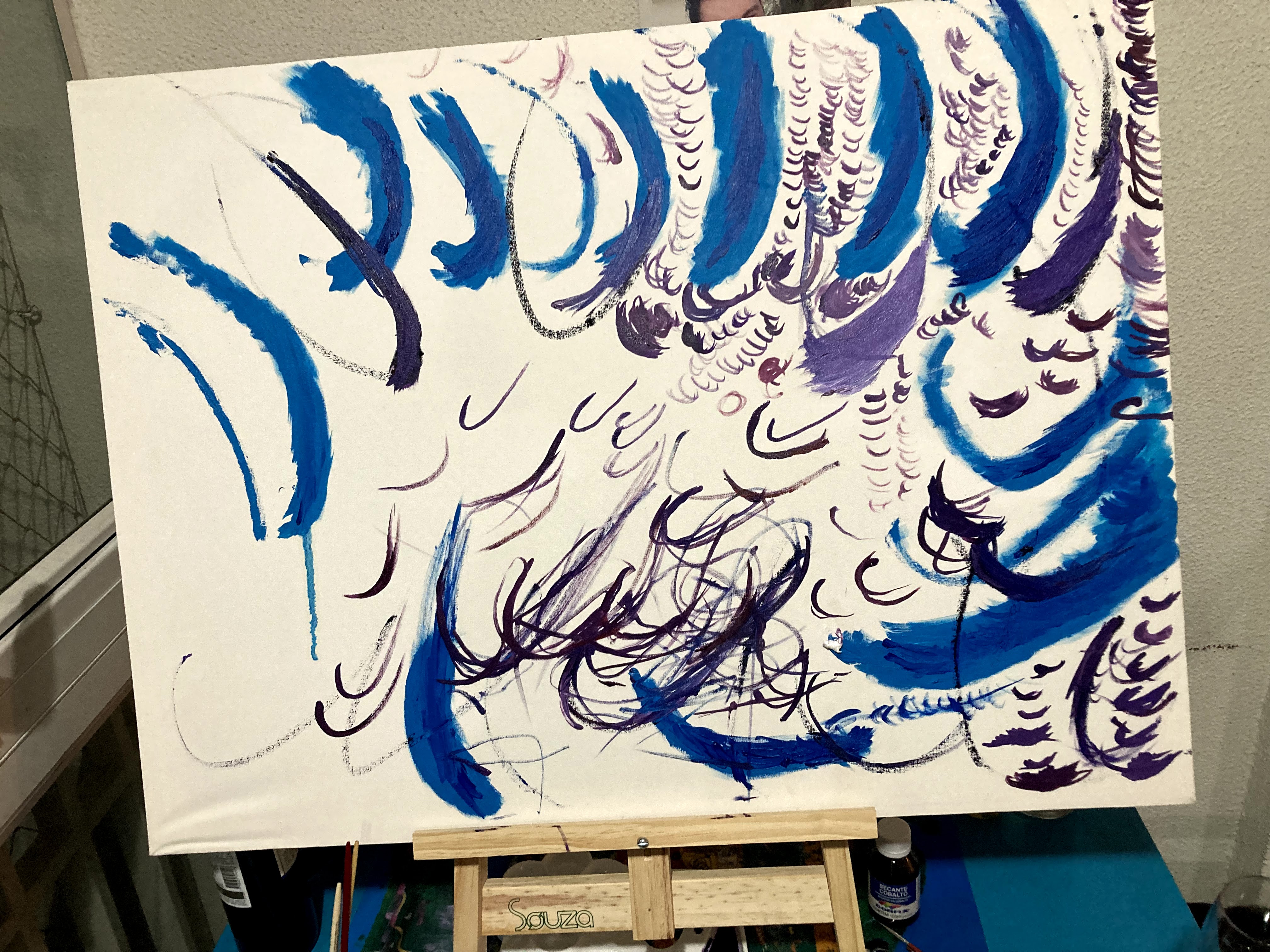 Aliás hoje foi a primeira vez em que me permiti algumas inovações no protocolo de pintur.Fiz duas cores (azul e violeta) e usei bastante a mão esquerda pela primeira vez na tentativa de fazer meu cérebro entender que ainda possui mão braço esquerdo. Isso tornou a sessão de pintura mais cansativa mas não menos prazerosa.Fiquei satisfeito de ter botado meu cérbro para reconhecer novamente o lado hemiparético para depois quem sabe um dia ele conseguir novamente fazer uso do meu lado esquerdo.