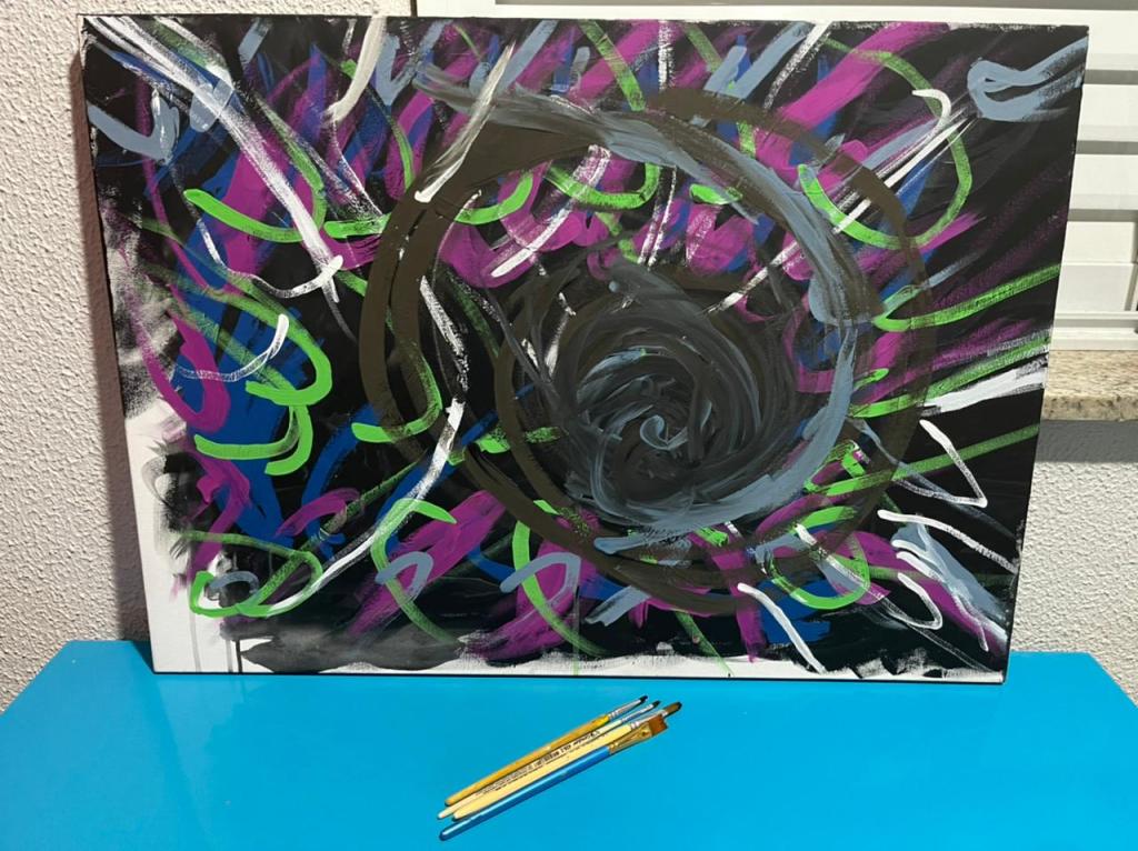 Recentemente, durante uma sessão de terapia eu descrevi assim a sensação física e visual de estar em coma ou em quase-morte e lutar pela vida. Passados 5 anos do trauma essas sensações e visões voltaram e aprendi a acessar aquele momento voluntariamente a partir de meditação e reviver o trauma e minha trajetória nesse estado de reabilitação permanente. Após uma dessas” visitas” voltei com uma súbita vontade de pintar – mesmo sem saber pintar – uma tela representando as cores e padrões que eu vi e senti durante aquele período.